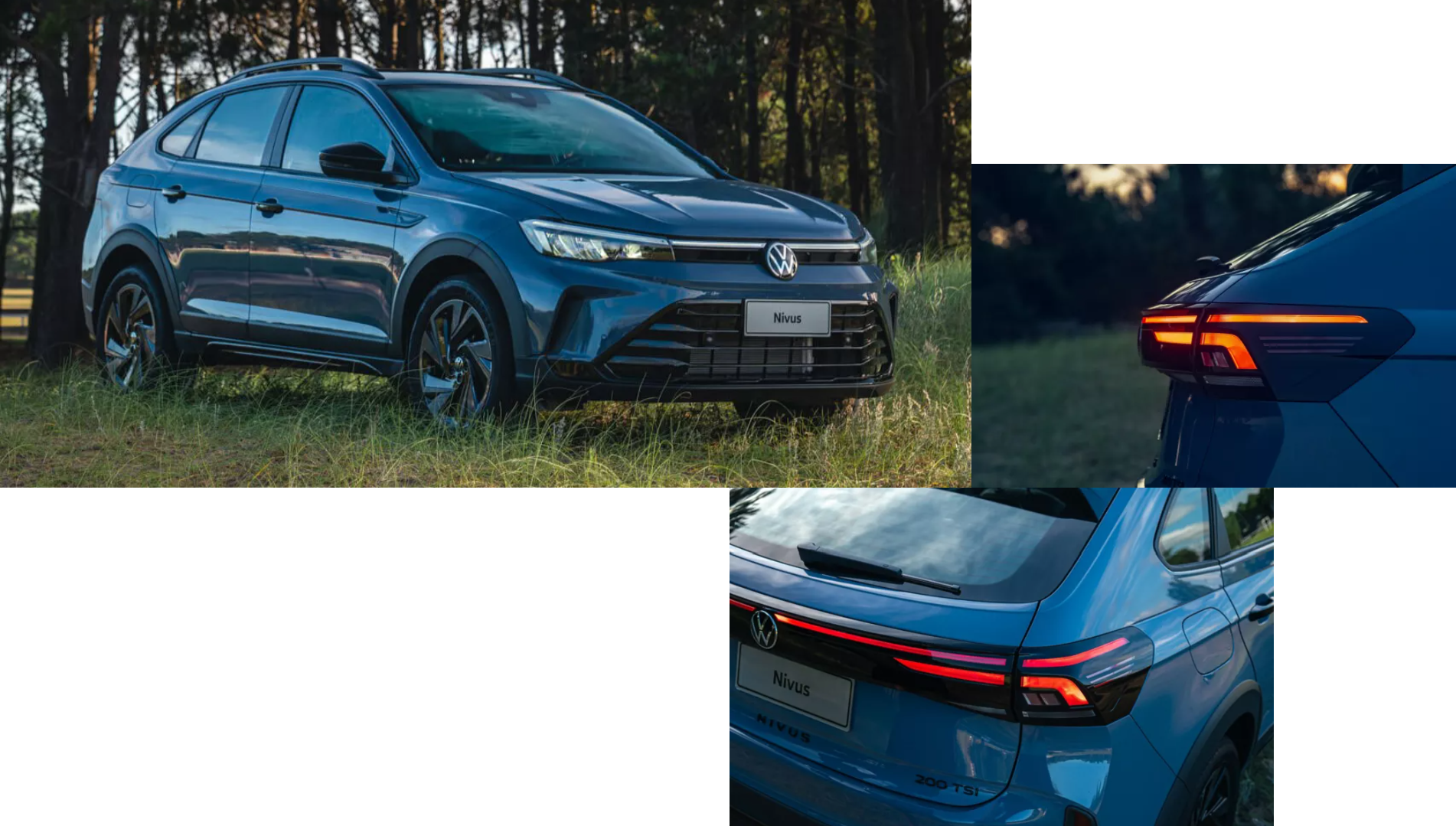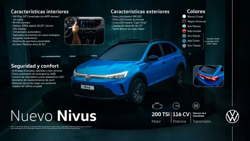 Diseño renovado Sus líneas se volvieron más armoniosas y con un estilo deportivo con mucha personalidad. Además de su atractivo, se destaca su nueva grilla LED frontal iluminada y cuenta con una línea LED trasera "Light Strip" que hace a tu Volkswagen inconfundible. Nuevas llantas El Nuevo Nivus posee llantas de 17 pulgadas que tienen un acabado en diamante y negro piano que le dan exclusividad. Detalles oscurecidos - Exclusivo Outfit El Nuevo Nivus incluye techo bitono en color negro, como también llantas, manijas, espejos y batch para darle más deportividad a la versión Outfit. Política de privacidad Terminos y condiciones -